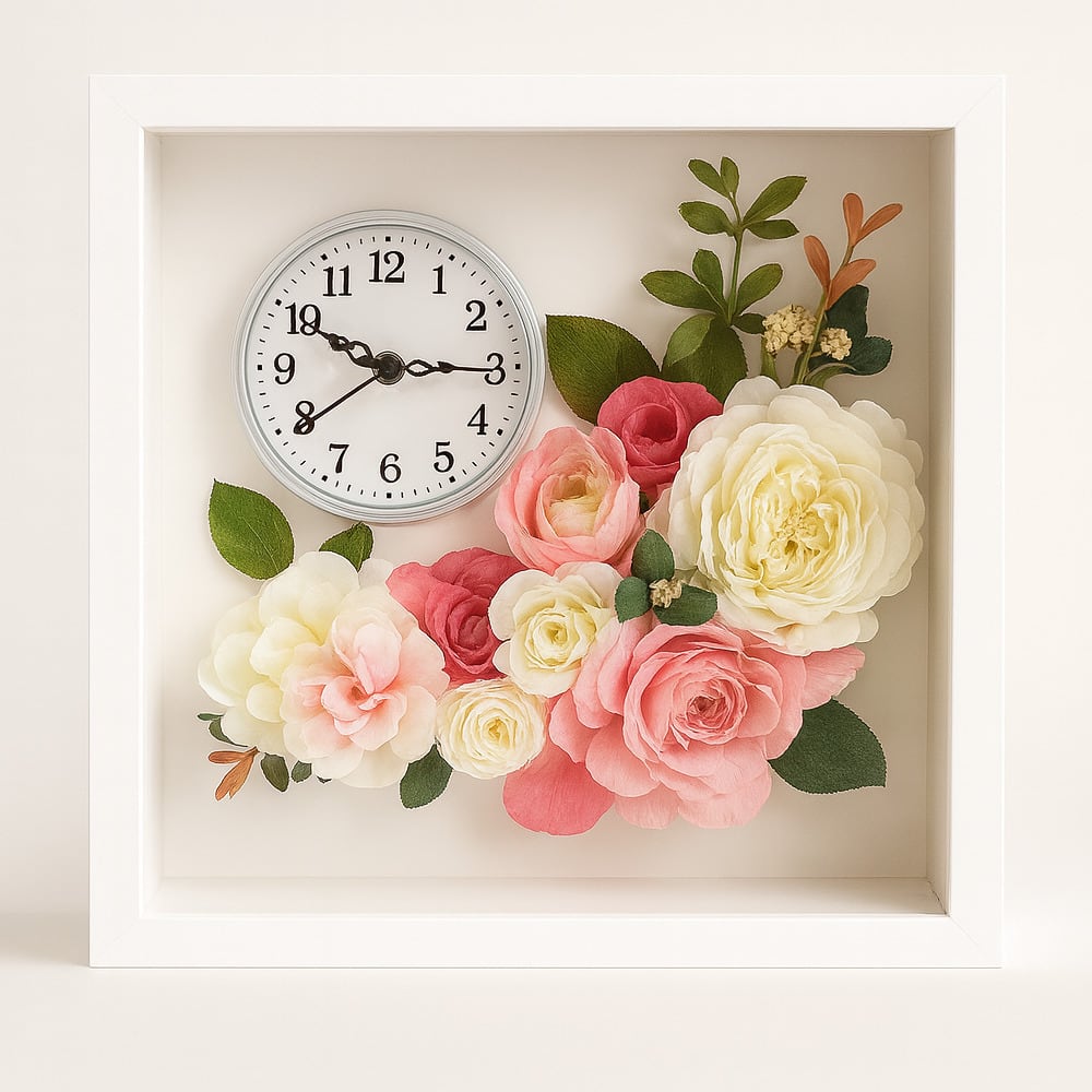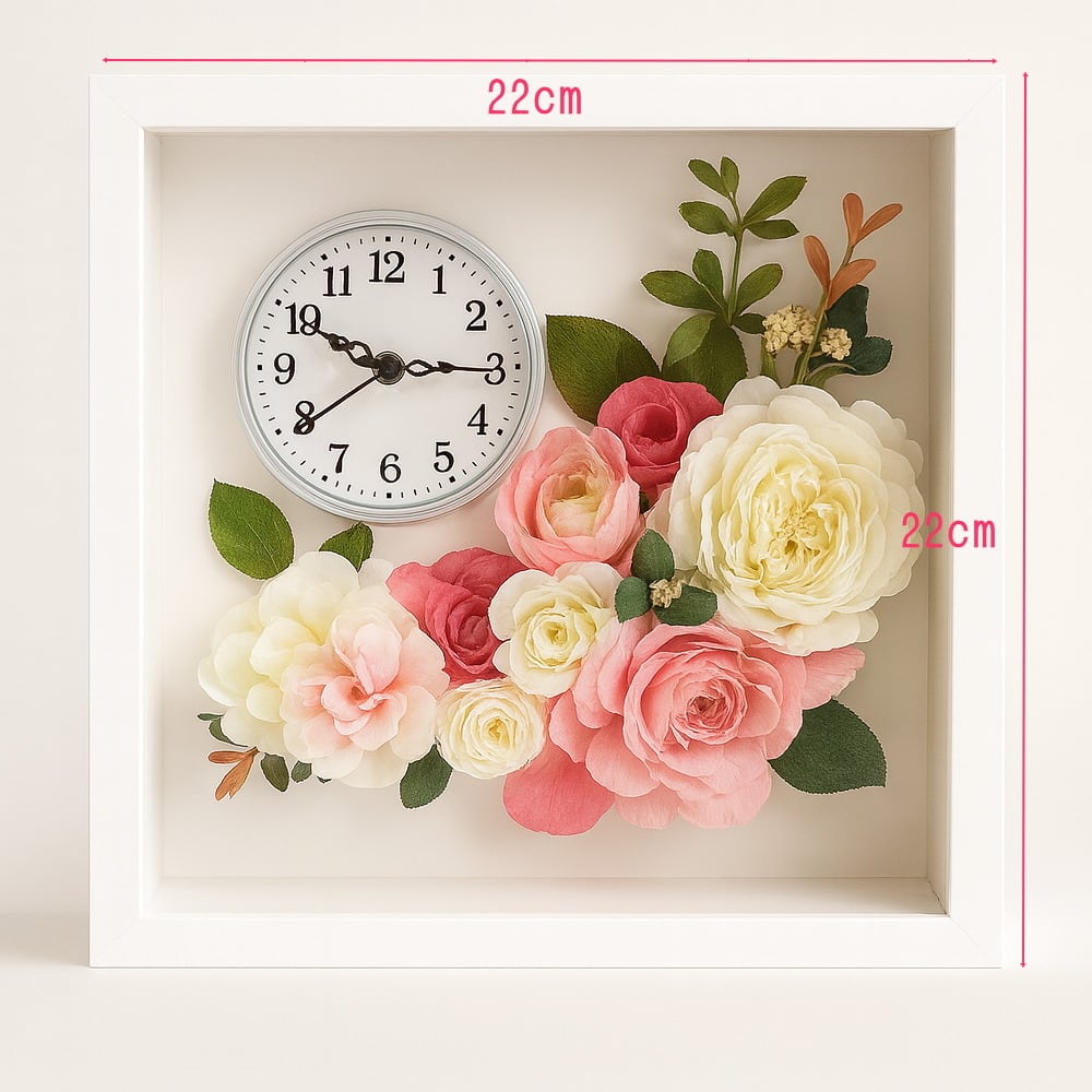 ・優雅な白いボックスにデザインされたこの置時計は、インテリアとして美しく彩りを添えます。アーティフィシャルフラワーは、どんな季節でも楽しめるお花を使用しており、長くご愛用いただけるアイテムです。