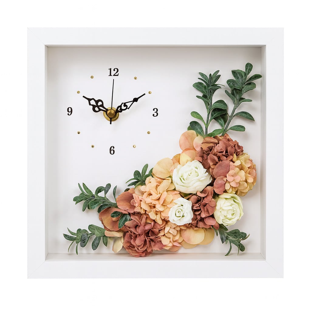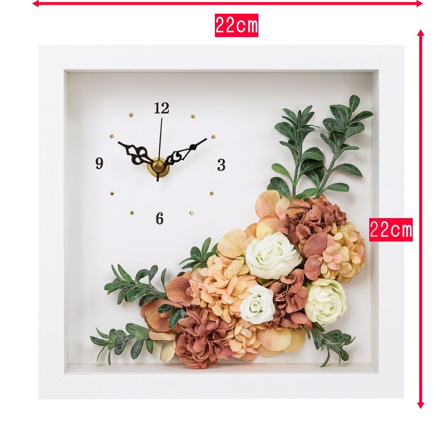 ・優雅な白いボックスにデザインされたこの置時計は、インテリアとして美しく彩りを添えます。アーティフィシャルフラワーは、どんな季節でも楽しめるお花を使用しており、長くご愛用いただけるアイテムです。