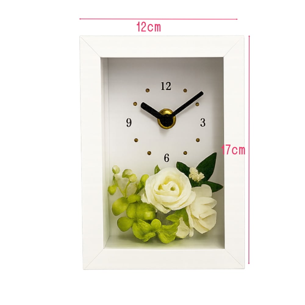 ・優雅な白いボックスにデザインされたこの置時計は、インテリアとして美しく彩りを添えます。アーティフィシャルフラワーは、どんな季節でも楽しめるお花を使用しており、長くご愛用いただけるアイテムです。