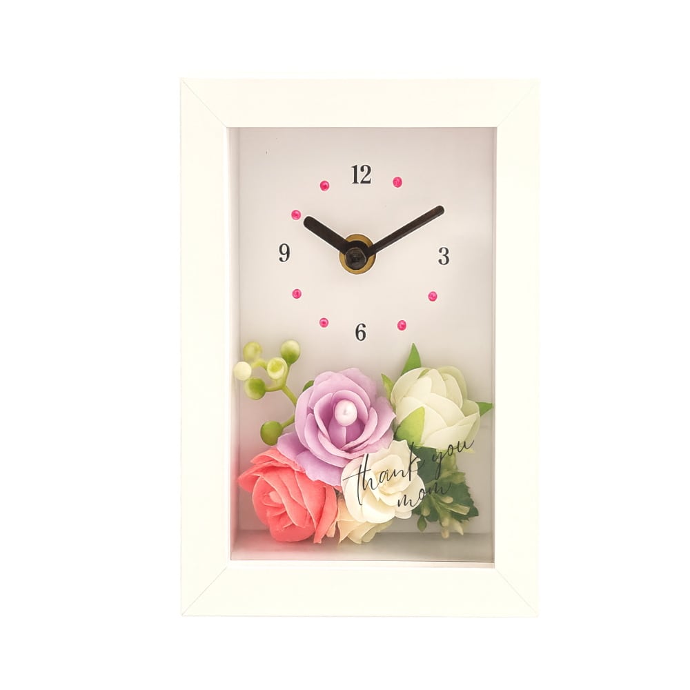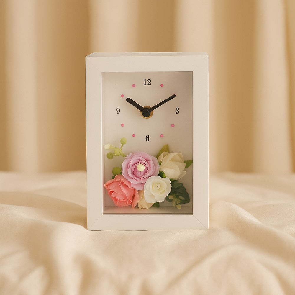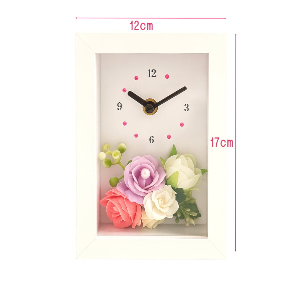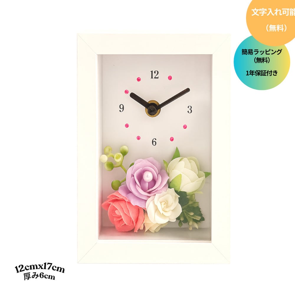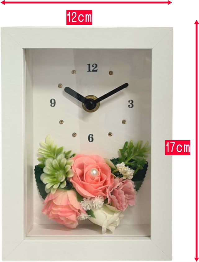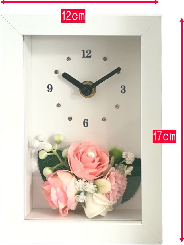 ・優雅な白いボックスにデザインされたこの置時計は、インテリアとして美しく彩りを添えます。アーティフィシャルフラワーは、どんな季節でも楽しめるお花を使用しており、長くご愛用いただけるアイテムです。