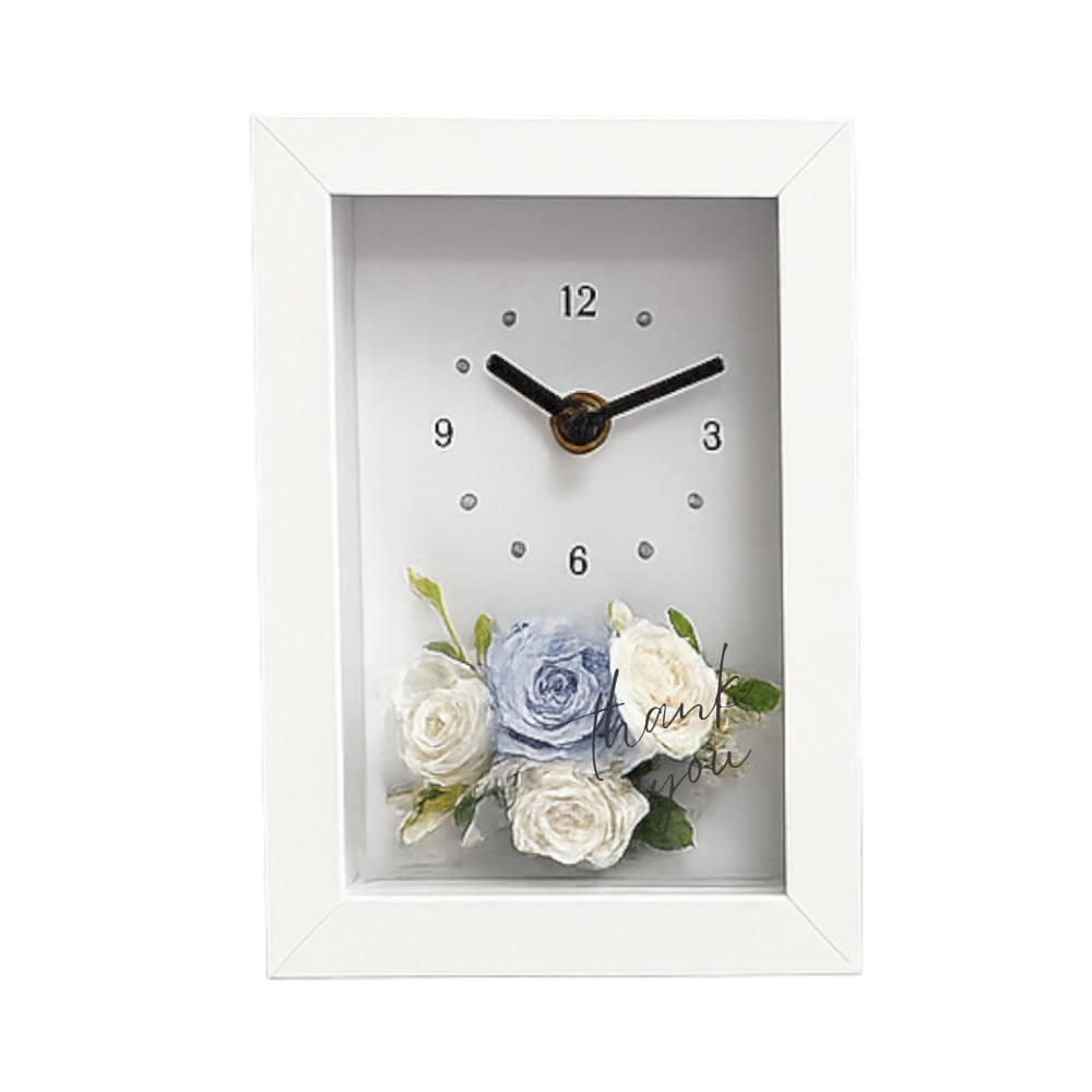 ・優雅な白いボックスにデザインされたこの置時計は、インテリアとして美しく彩りを添えます。アーティフィシャルフラワーは、どんな季節でも楽しめるお花を使用しており、長くご愛用いただけるアイテムです。