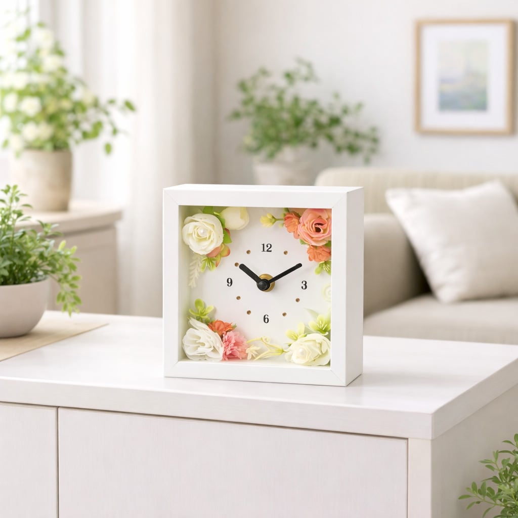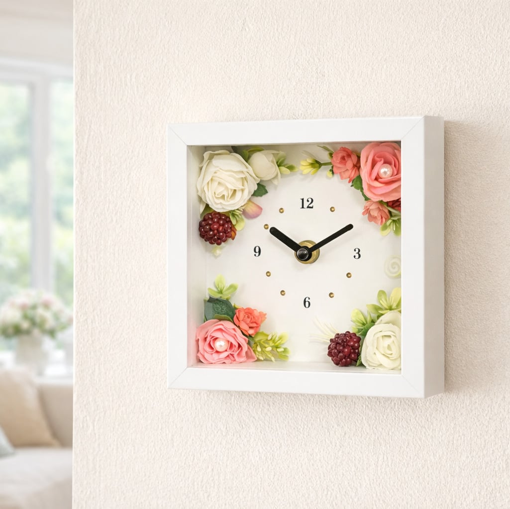 「スイートスクエア」は、正方形フレームの中に華やかなアーティフィシャルフラワーをあしらった、インテリア性の高いフラワークロックです。
