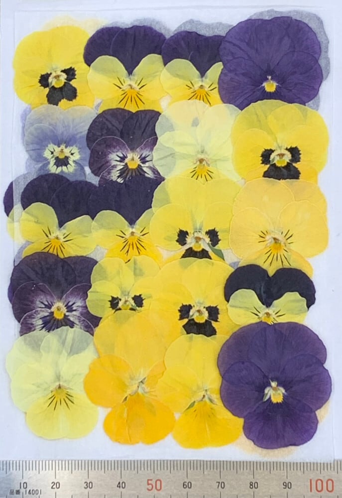 ・自然色のビオラの押し花を色とりどりのミックスでお入れしています。