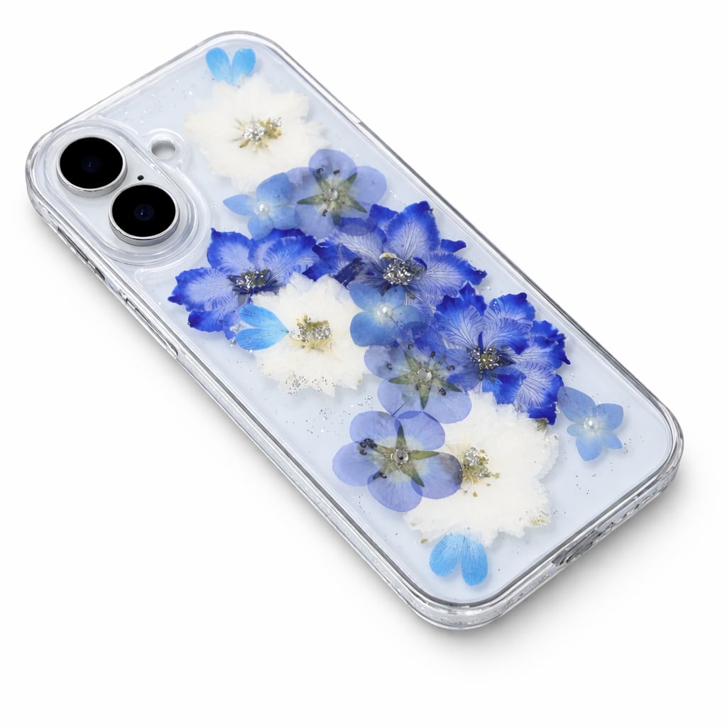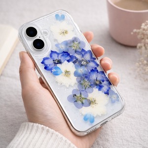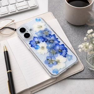 ・クリアハードケースにデルフィニウム・千鳥草・ネモフィラ他 押し花をUVレジンでコーティングしたスマホケースです!