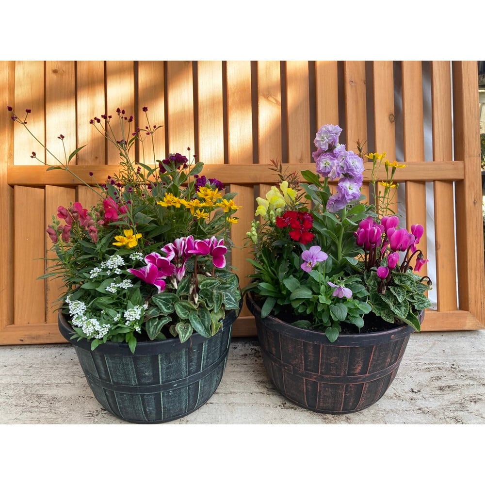 季節の寄せ植え アンティーク柄 軽量プラスチック鉢 内径24cm 2鉢セット (鉢の色選択不可 )1鉢に6〜7種類のお花で構成 鉢植え ラッピング不可 ギフトメッセージOK
