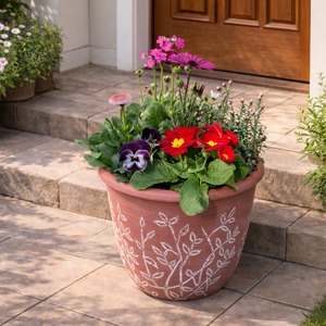 季節の寄せ植え リーフ柄 軽量プラスチック鉢 内径24cm (レッド・4色展開)6〜7種類のお花で構成 鉢植え ラッピング不可 ギフトメッセージOK
