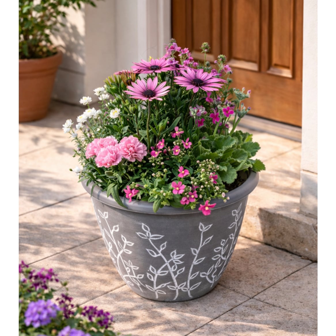 季節の寄せ植え リーフ柄 軽量プラスチック鉢 内径24cm (グレー・4色展開)6〜7種類のお花で構成 鉢植え ラッピング不可 ギフトメッセージOK
