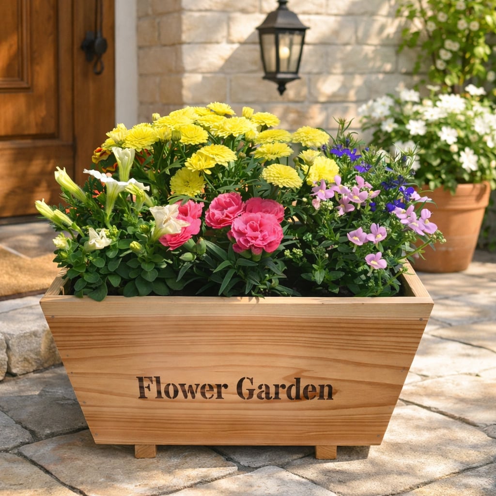 季節の寄せ植え ハンドメイドウッドポット(長方形) 国産杉使用6〜7種類のお花で構成 鉢植え ラッピング不可 ギフトメッセージOK