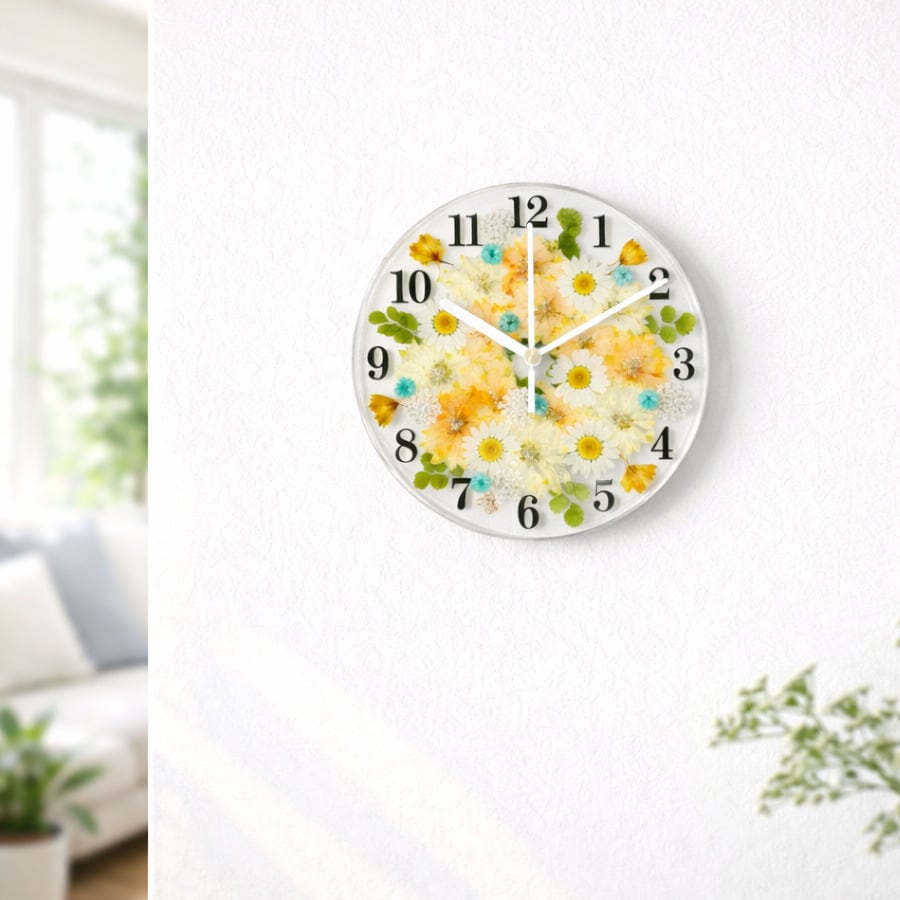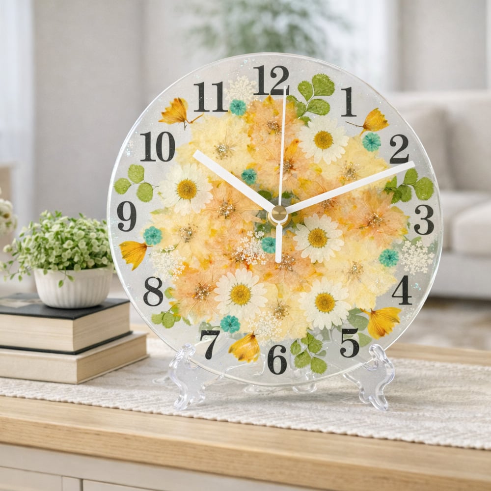・押し花をUVレジンでコーティングしたハンドメイドの花時計です。掛け時計・置時計どちらでもご利用いただけます!
